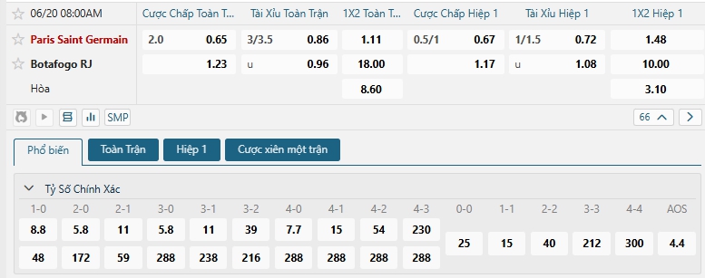 Bảng tỷ lệ kèo bóng đá trận đấu PSG vs Botafogo