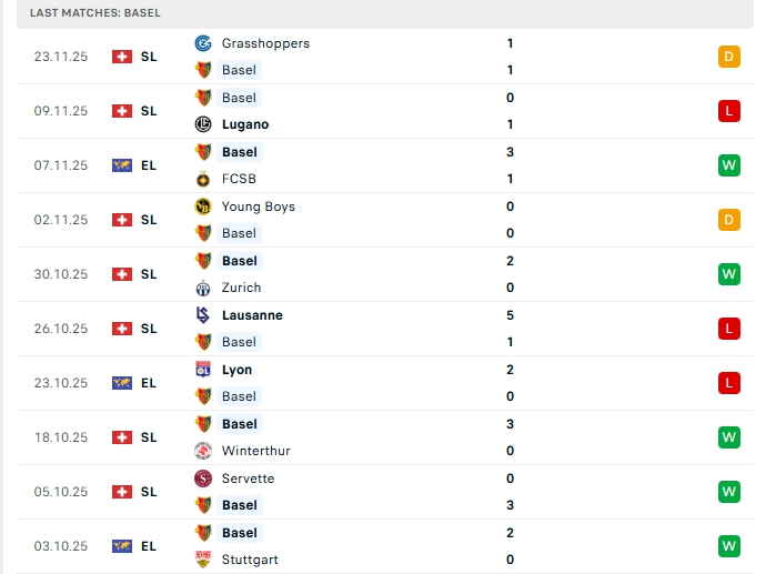 Basel là đại diện đến từ Thụy Sỹ, sau 4 lượt trận hàng công mang về 6 bàn thắng, cùng hàng thủ nhận 5 bàn thua, 2/3 trận đấu đó khép lại không quá 2 bàn, khi thi đấu xa nhà ở 3/5 trận vừa qua khép lại không quá 2 bàn.