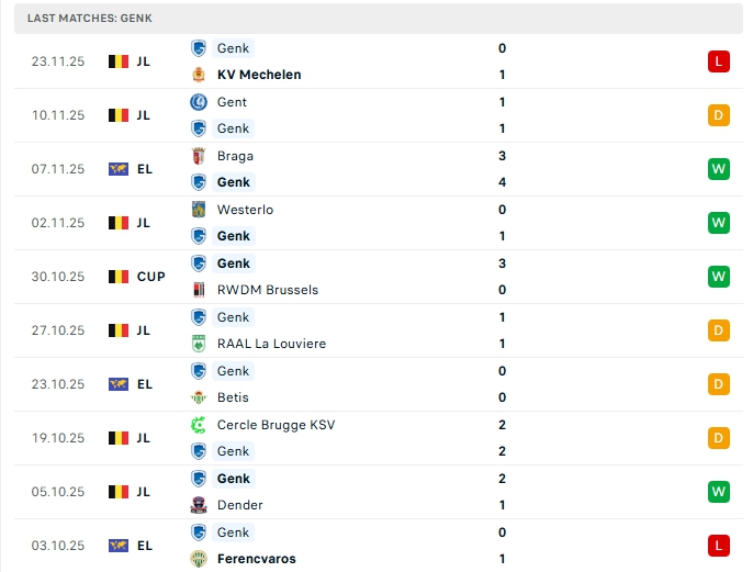 Racing Genk sau 4 lượt trận đại diện Bỉ có được 5 bàn thắng trong đó hàng thủ nhận 4 bàn thua, 3/4 trận đấu đó của Racing Genk khép lại không quá 2 bàn thắng, trên sân nhà của mình Racing Genk ở 3/5 trận vừa qua khép lại không quá 2 bàn.