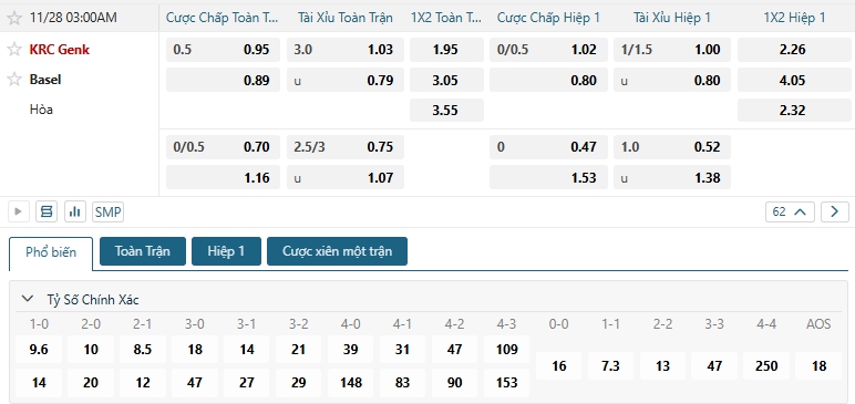 Bảng tỷ lệ kèo bóng đá trận đấu Racing Genk vs Basel
