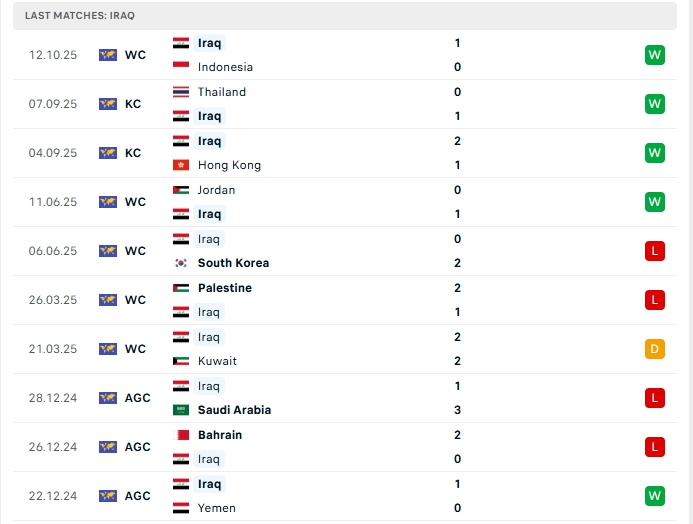 Iraq ở 5 trận gần nhất, hàng công của đội bóng này chỉ mang về 5 bàn thắng cùng hàng thủ nhận 3 bàn thua, 4/5 trận đấu đó đều khép lại không quá 2 bàn, khi thi đấu xa nhà ở 4/5 trận vừa qua khép lại không quá 2 lần lưới rung.