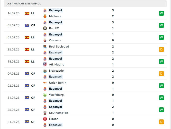 Bên kia sân, Espanyol cũng đang có khởi đầu tốt ở mùa giải năm nay, đội bóng này thắng 3 và hòa 1 ở 4 trận vừa qua, có được 10 điểm và đang xếp ở vị trí thứ 3 trên BXH, thành tích bất bại, ở ngày ra quân Espanyol có chiến thắng ấn tượng trước Atletico Madrid, sau đó là trận hòa trước Real Sociedad, và mới đây là 2 chiến thắng liên tiếp trước Mallorca và Osasuna, phong độ thời gian qua của Espanyol là ấn tượng, đội bóng này bất bại ở 12 trận gần nhất, khi thi đấu xa nhà họ cũng bất bại 6 trận vừa qua với 3 chiến thắng và 3 hòa.