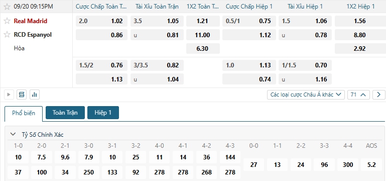 Nhà cái châu Á đang đánh giá cao khả năng chiến thắng của chủ nhà Real Madrid là cao hơn nhiêu , khi đưa ra mức chấp đang là 2.0, Real Madrid với ưu thế sân nhà, thực lực vượt trội cùng phong độ ấn tượng sẻ là đội được dự đoán có cho mình chiến thắng, dù đối thủ Espanyol cũng đang chơi cực kỳ tốt, nhưng trước một Real Madrid vượt trội thì khó lòng để Espanyol có thể giữ điểm số, trong 5 lần đón tiếp Espanyol trên sân nhà thì Real Madrid có 4 lần tạo được chiến thắng cách biệt, lựa chọn Real Madrid cho kèo Châu Á.