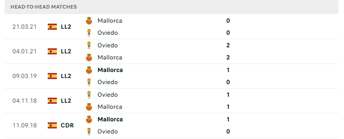 Những màn đụng độ giữa Real Oviedo và Mallorca thường diễn ra chắc chắn với ít bàn thắng được tạo ra, cụ thể ở 4/5 lần gặp nhau gần nhất và 3/5 lần đón tiếp Mallorca trên sân nhà của Real Oviedo khép lại không quá 2 lần lưới rung.