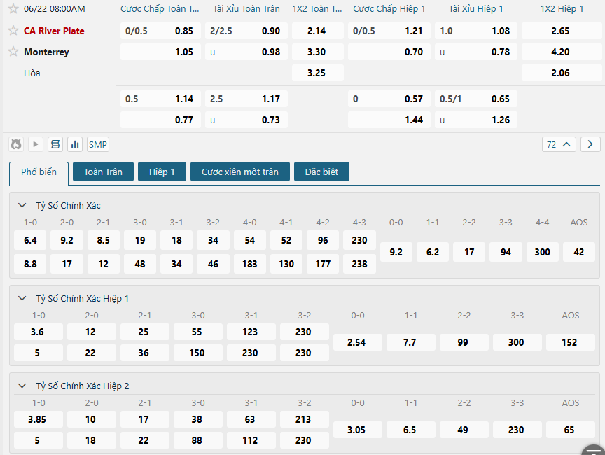 Bảng tỷ lệ kèo bóng đá trận đấu River Plate vs Monterrey