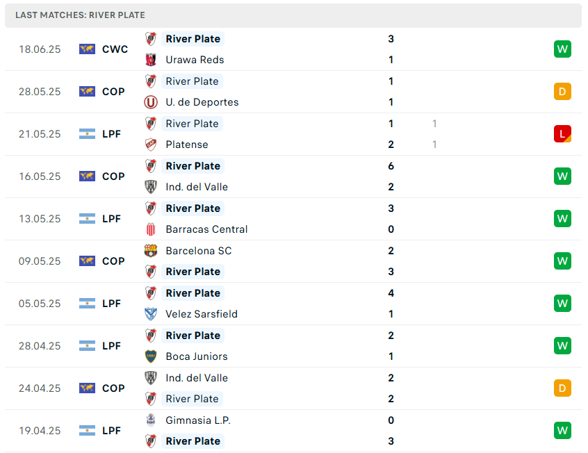 River Plate ở lượt trận đầu tiên họ đã khởi đầu thành công khi chỉ phải đối đầu với đối thủ yếu nhất của bảng E là Urawa Red, Đại diện của Argentina đã có được 1 chiến thắng dễ dàng với tỉ số 3-1 qua đó giành 3 điểm để tạm thời leo lên dẫn đầu về mặt điểm số ở bảng đấu của mình. Ở lượt đấu thứ 2 họ cần chiến thắng để tiếp tục giữ vững ngôi đầu bảng của mình nên sẽ thi đấu với quyết tâm cao nhất, tuy vậy đối thủ cũng khá mạnh nên khó để River Plate có thể hoàn thành mục tiêu.