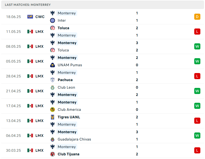 Monterrey là đại diện đến từ Mexico, họ bị đánh giá thấp ở bảng đấu này nhưng cũng đã có mở màn thành công khi cầm hoà được đội bóng mạnh nhất của bảng đấu là Inter với tỉ số 1-1, chính trận hoà này giúp Monterrey tạm thời đứng thứ 2 của bảng E, nếu tiếp tục giành được điểm số ở lượt trận thứ 2 thì khả năng họ giành vé đi tiếp là rất cao, chính vì điều này nên các cầu thủ Monterrey sẽ lựa chọn lối chơi phòng ngự nhằm mục tiêu giành điểm ở trận đấu tới.
