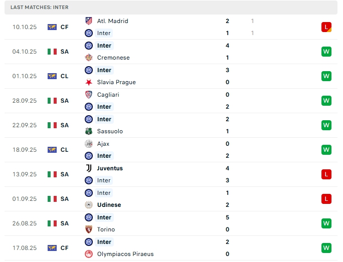 - Phong độ Inter Milan