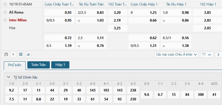 Nhà cái châu Á đang đánh giá cao khả năng chiến thắng của các vị khách Inter Milan, khi đưa ra mức chấp đang là 0.25, Inter Milan dù phải thi đấu xa nhà nhưng họ được đánh giá cao về thực lực so với đối thủ, nhưng không vì thế mà các vị khách dễ dàng có được chiến thắng khi đối đầu với một Roma đang thăng hoa và chơi lối chơi đầy khoa học và kỷ luật ở mùa giải năm nay, dù lịch sử đối đầu không ủng hộ nhưng với màn thể hiện thời gian qua Roma khả năng sẻ có điểm cho mình trong trận đấu tới, lựa chọn Roma cho kèo châu Á.