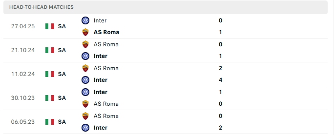 Những màn đụng độ giữa Roma và Inter Milan thường diễn ra chặt chẻ với ít bàn thắng, cụ thể ở 4/5 lần gặp nhau gần nhất và 2/3 lần đón tiếp Inter Milan trên sân của Roma gần đây cũng khép lại không quá 2 bàn thắng.