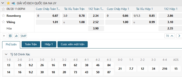 Bảng tỷ lệ kèo bóng đá trận đấu Rosenborg vs Viking