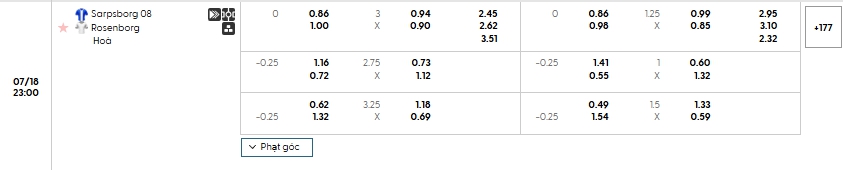 Bảng tỷ lệ kèo bóng đá trận đấu Sarpsborg vs Rosenborg