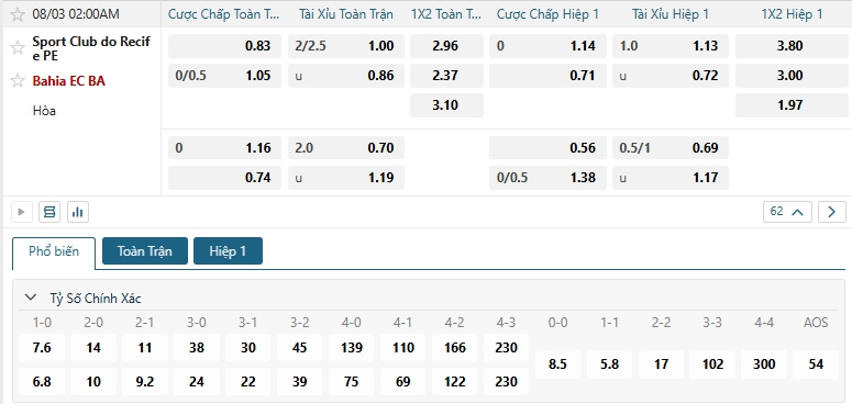 Bảng tỷ lệ kèo bóng đá trận đấu SC Recife vs Bahia