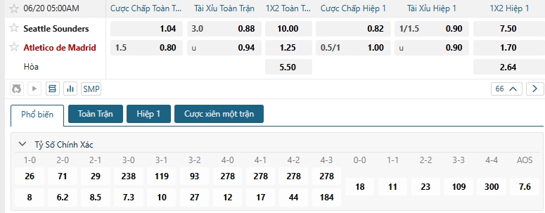 Bảng tỷ lệ kèo bóng đá trận đấu Seattle Sounders vs Atletico Madrid