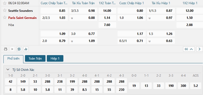 Bảng tỷ lệ kèo bóng đá trận đấu Seattle Sounders vs PSG