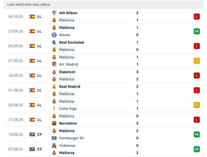 Bên kia sân, Mallorca ở vòng đấu gần nhất họ nhận thất bại 1-2 trước Ath Bilbao, đây là trận thua thứ 5, sau 8 vòng cùng với 1 chiến thắng, 2 hòa có được5 điểm và đang xếp cuối cùng trên BXH, phong độ thời gian qua của Mallorca là không tốt, họ chỉ thắng 1 ở 5 vòng gần nhất và khi xa nhà đội bóng này toàn thua ở 4 trận liên tiếp vừa qua.