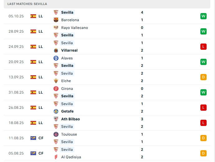Sevilla sau 8 trận đấu, đội bóng này mang về 4 chiến thắng, 1 hòa và nhận 3 thất bại, có được 13 điểm và đang xếp vị trí thứ 6 trên BXH, ở vòng đấu gần nhất Sevilla có chiến thắng ấn tượng 4-1 trước Barcelona, đây là trận thắng thứ 2 liên tiếp của họ và là chiến thắng thứ 3 ở 4 vòng gần nhất, trên sân nhà Sevilla sau 4 trận có được 1 chiến thắng, 1 hòa và 2 thất bại.