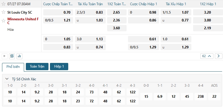 Bảng tỷ lệ kèo bóng đá trận đấu St. Louis City SC vs Minnesota Utd