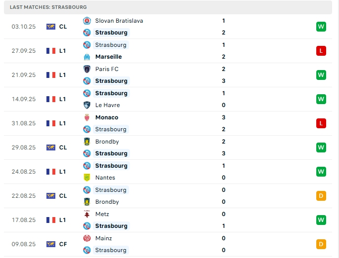 Strasbourg sau 6 lượt trận đầu tiên, hàng công của đội bóng này chơi khá tốt với 9 bàn thắng có được cùng hàng thủ chơi tệ khi nhận 7 bàn thua, 4/5 trận gần nhất của Strasbourg khép lại từ 3 bàn trở lên, trên sân nhà họ thường chủ động chơi chắc chắn và số đông cầu thủ nơi hàng phòng ngự.