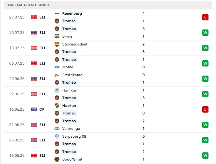 Tromso ở vòng đấu gần nhất họ nhận thất bại trước Rosenborg, thất bại này chấm dứt chuỗi 5 trận toàn thắng trước đó, sau 16 trận đấu cùng với 10 chiến thắng, 1 hòa và 4 thất bại có được 31 điểm và đang xếp vị trí thứ 3 trên BXH, phong độ thời gian qua của Tromso là ấn tượng, đặc biệt trên sân nhà với 4 chiến thắng liên tiếp vừa qua.