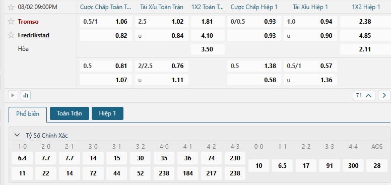 Bảng tỷ lệ kèo bóng đá trận đấu Tromso vs Fredrikstad