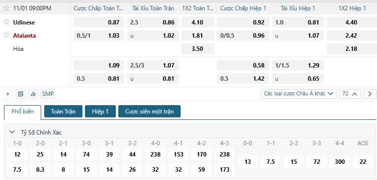 Bảng tỷ lệ kèo bóng đá trận đấu Udinese vs Atalanta