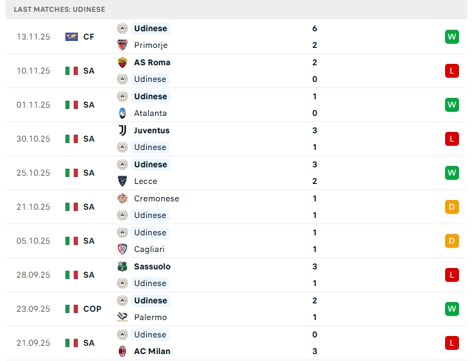 - Phong độ Udinese