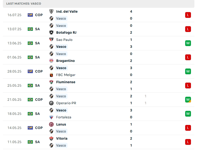 Vasco sau 13 lượt trận họ mang về 4 chiến thắng, 1 hòa và nhận đến 8 thất bại, có được13 điểm và đang xếp vị trí thứ 15 trên BXH, phong độ thời gian qua của Vasco là không tốt khi họ chỉ có được 2 chiến thắng và nhận 3 thất bại sau 5 trận gần nhất, trên sân nhà của mình Vasco cũng toàn thua ở 2 vòng vừa qua.