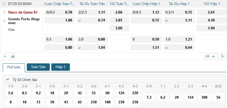Bảng tỷ lệ kèo bóng đá trận đấu Vasco vs Gremio