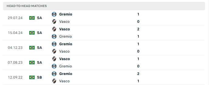 Những màn đụng độ giữa Vasco và Gremio thường diễn ra với sự chặt chẻ và ít bàn thắng được tạo ra, 3/5 trận mà hai đội chạm mặt nhau gần nhất và 3/5 lần đón tiếp Gremio trên sân của Vasco khép lại 90 phút không quá 2 bàn.