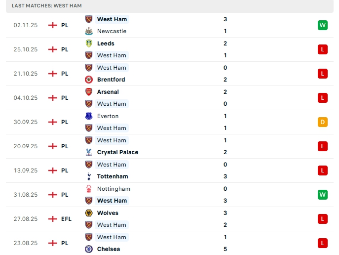 West Ham Utd sau 10 trận đấu họ mang về 2 chiến thắng, 1 hòa cùng 7 thất bại, có được 7 điểm và đang xếp vị trí thứ 18 trên BXH, một vị trí trong nhóm cầm đèn đỏ, ở vòng đấu gần nhất West Ham Utd có chiến thắng ấn tượng 3-1 trước Newcastle, trận thắng này chấm dứt chuỗi 6 trận không thắng trước đó, dù vậy phong độ thời gian qua của West Ham Utd là không tốt, trên sân nhà họ cũng chỉ thắng 1 và thua 4 ở 5 trận vừa qua.