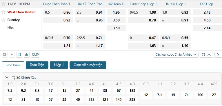 Bảng tỷ lệ kèo bóng đá trận đấu West Ham Utd vs Burnley