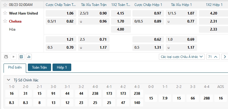 Bảng tỷ lệ kèo bóng đá trận đấu West Ham Utd vs Chelsea