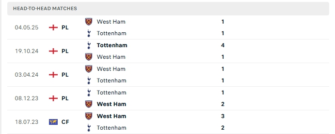 Những màn đụng độ giữa West Ham Utd và Tottenham thường diễn ra hấp dẫn với nhiều bàn thắng được tạo ra, cụ thể ở 3/5 lần gặp nhau gần nhất khép lại từ 3 bàn trở lên.