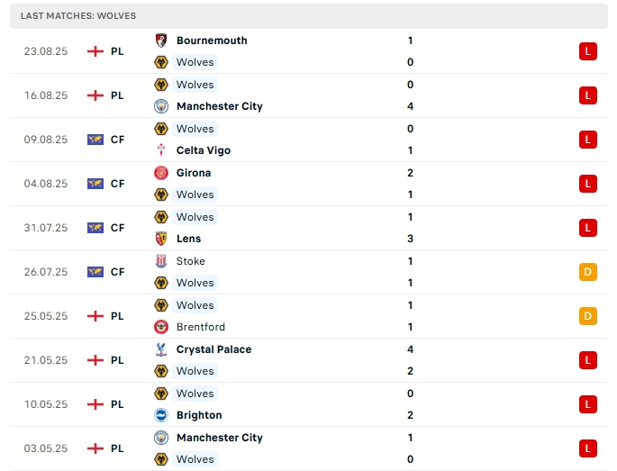 Wolves ở trận ra quân họ nhận thất bại đậm 0-4 trước Man City, ở trận sau đó họ tiếp tục gây thất vọng khi để thua 0-1 trước Bournemouth, chưa có điểm số nào và đang tạm xếp vị trí 19 trên BXH, phong độ thời gian qua của Wolves là cực kỳ tệ hại khi không có chiến thắng nào ở 10 trận đã qua, trong đó có đến 8 thất bại và 2 hòa. Trên sân nhà của mình Wolves cũng chơi tệ khi thua 4 trên 5 trận gần nhất.