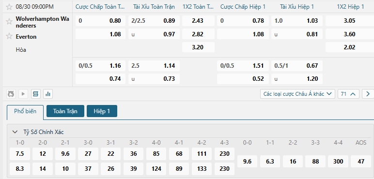 Nhà cái châu Á đang đánh giá cao khả năng chiến thắng của hai đội là khá cân bằng khi đưa ra mức chấp đang là đồng banh, Wolves đang gặp nhiều khó khăn về mặt phong độ dù vậy họ có ưu thế sân nhà, trong khi Everton đang cho thấy sự khởi sắc sau chiến thắng vừa qua, nhưng lại chơi không tốt khi xa nhà, một kết quả hòa sẻ là hợp lý ở màn đụng độ này.