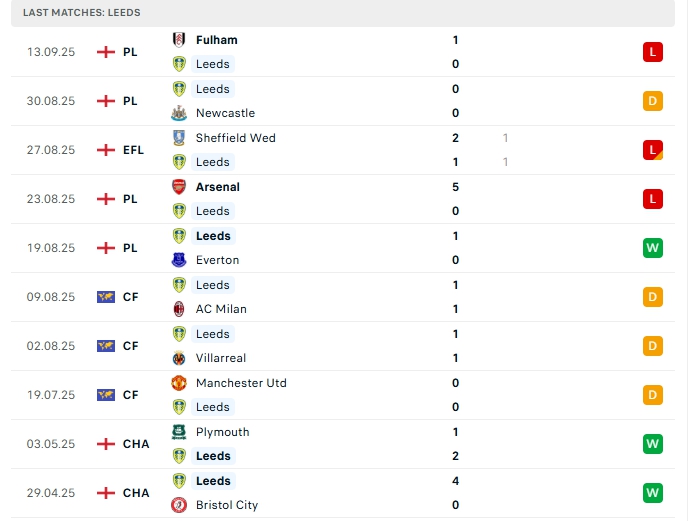 Leeds Utd sau 4 trận đấu tân binh của mùa giải năm nay mang về chỉ 1 bàn thắng nhưng hàng thủ chơi tệ khi cũng đã nhận 6 bàn thua, 3/4 trận đấu đó khép lại không quá 2 bàn, khi thi đấu xa nhà ở 3/5 trận vừa qua có từ 3 bàn trở lên, việc hàng thủ chơi tệ cũng sẻ khiến Leeds Utd gặp nhiều khó khăn.