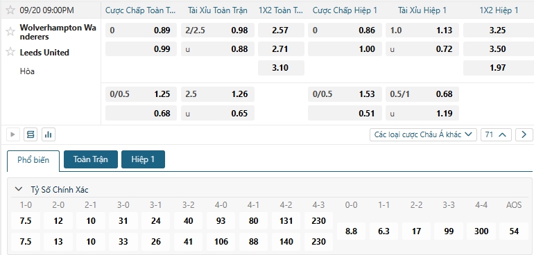 Nhà cái châu Á đang đánh giá cao khả năng chiến thắng của hai đội là khá cân bằng khi đưa ra mức chấp đang là đồng banh, Wolves đang gặp nhiều khó khăn về mặt phong độ dù vậy họ có ưu thế sân nhà, trong khi Leeds Utd có khời đầu ấn tượng nhưng lại đang cho thấy sự suy giảm ở 3 vòng vừa qua, và lại chơi không tốt khi xa nhà, trận đấu mà cả hai không đó được phong độ tốt thì yếu tố sân nhà sẻ là yếu tố quyết định, lựa chọn Wolves cho kèo châu Á.